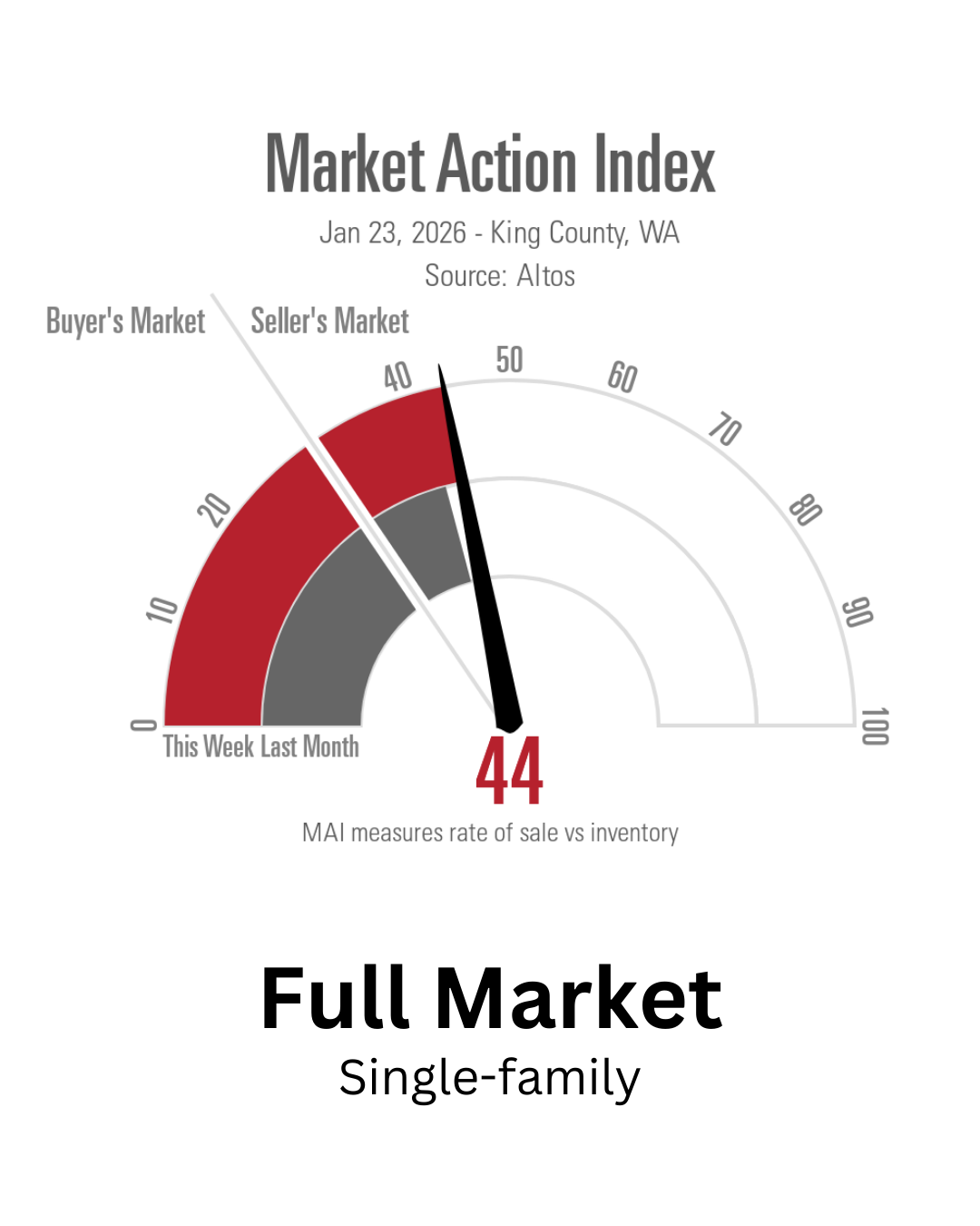 The King County single-family housing market remains stable as January 2026 comes to a close. According to the Market Action Index, the overall market sits at 44, which indicates balanced conditions leaning slightly toward sellers. However, that headline number masks meaningful differences across price tiers.